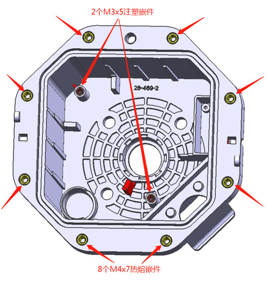 嵌件明细:8个M4x7热熔嵌件; 2个M3x5注塑嵌件