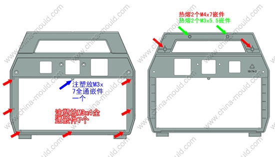 嵌件明细:热熔2个M4x7嵌件, 热熔2个M3x5.5嵌件, 注塑放7个M3x4全通嵌件, 注塑放1个M3x7全通嵌件。