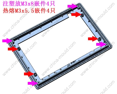 嵌件明细:注塑放M3x8嵌件4只,M3x5.5热熔嵌件4只