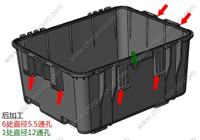 嵌件明细:后加工:6处直径5.5通孔,1处直径12通孔。