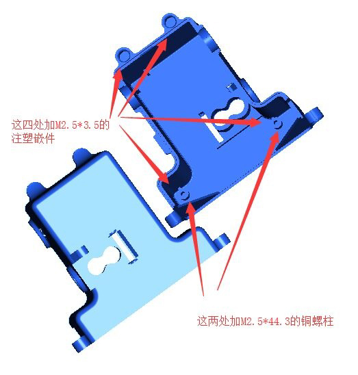 嵌件明细:M2.5*3.5注塑嵌件4只 M2.5*44.3铜螺柱2只