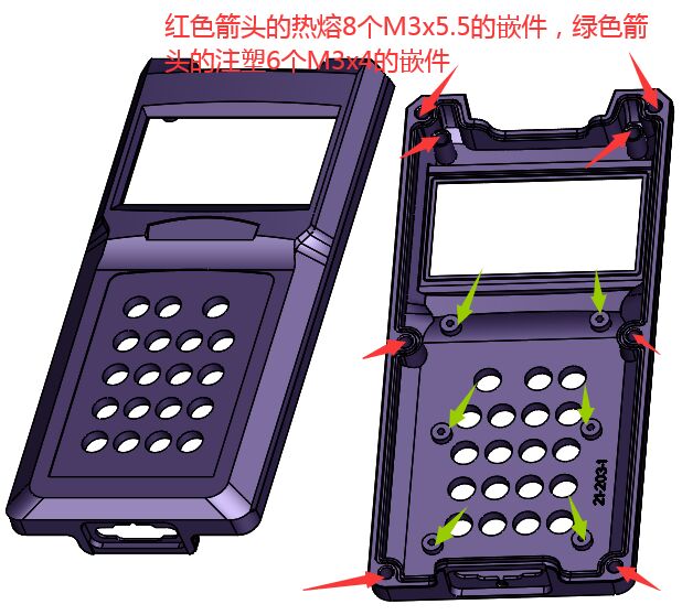 嵌件明细:热熔8个M3x5.5的嵌件,注塑6个M3x4的嵌件!