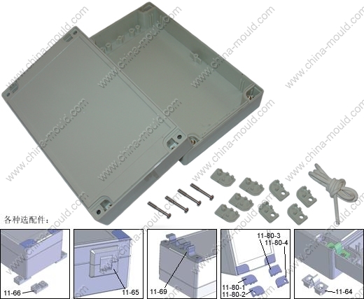 本壳体有一系列共19种尺寸可供选择,壳体正反面均有贴膜凹槽,均可按要求任意开孔,四周也可按要求开孔。内部柱子可修改。并有多种选配件。
