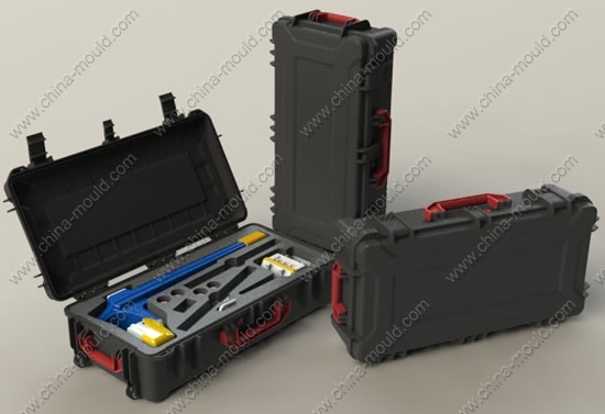 特点:全封闭、防尘、防水、牢固、轻便。箱体内部有海绵填充,可按产品尺寸定制内腔,起到防震作用。底部配有2只轮子,两侧各配有1只把手。