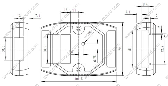 左边开孔30.6x13,右边开孔51x9.4,正面显示窗开孔38.9x13,正面有小圆孔。
